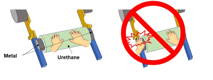 When replacing movable parts such as the main roller, please ensure that you press the emergency stop button and turn off the operation ready before shutting down the power and performing the work. If parts are replaced while the power is supplied, unintended movements may occur, leading to serious accidents such as entrapment or entanglement. Please conduct inspections and replacements, such as at the start of operations, with utmost care, following the operating manual and your company's safety work rules.